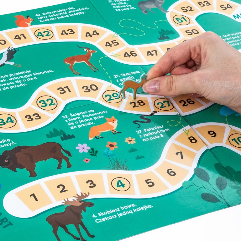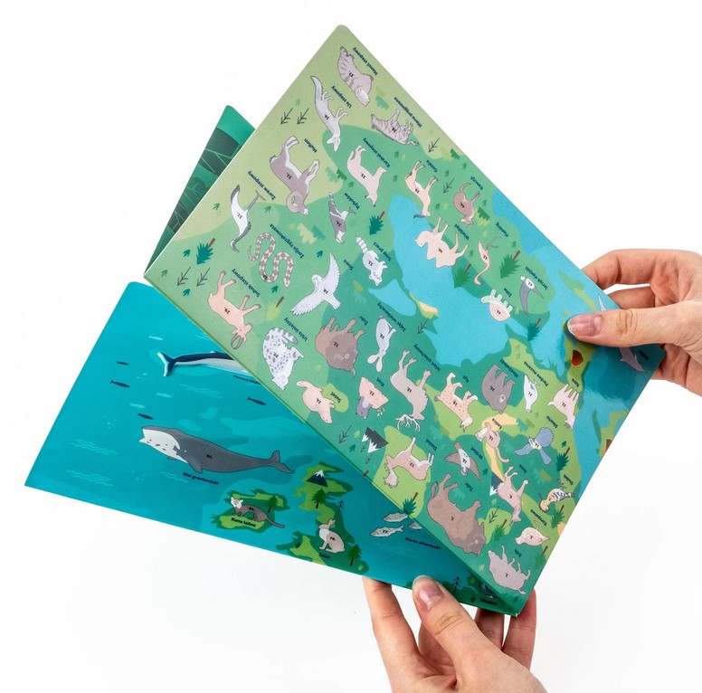 Dodatkowo, na odwrocie mapy czeka niespodzianka – wciągająca gra planszowa, która dostarczy wielu godzin rodzinnej rozrywki. To idealne połączenie nauki i zabawy: rozwija wyobraźnię, poszerza horyzonty i uczy o różnorodności świata przyrody.