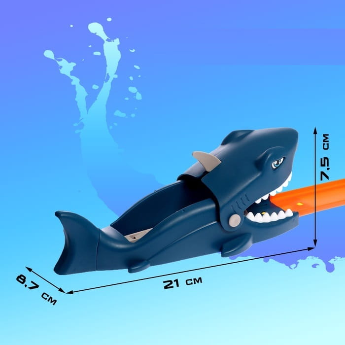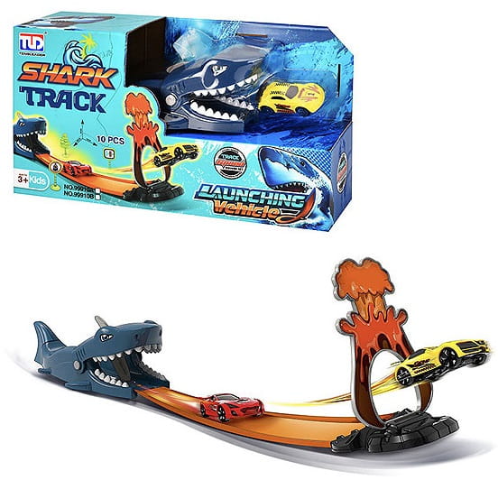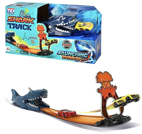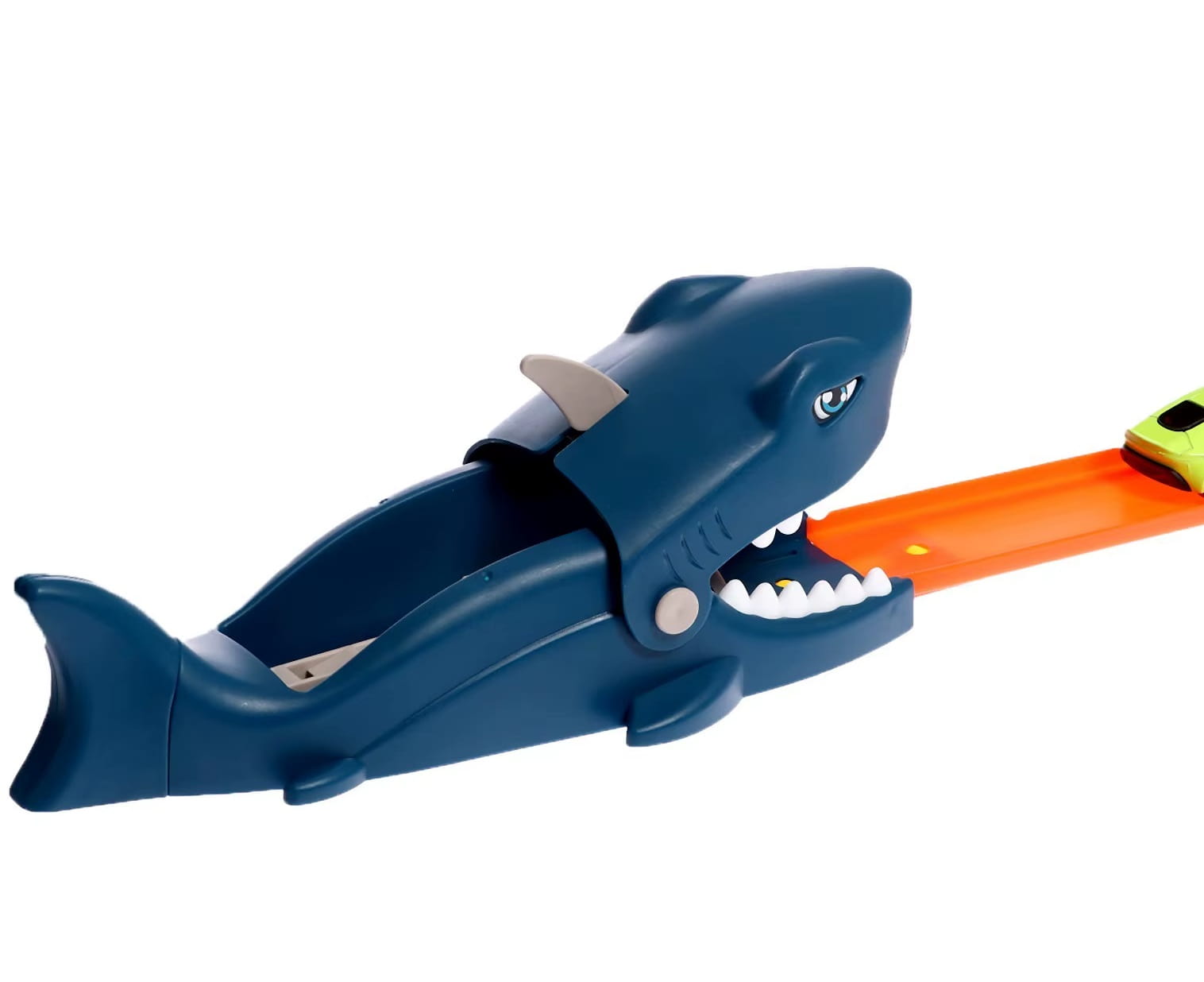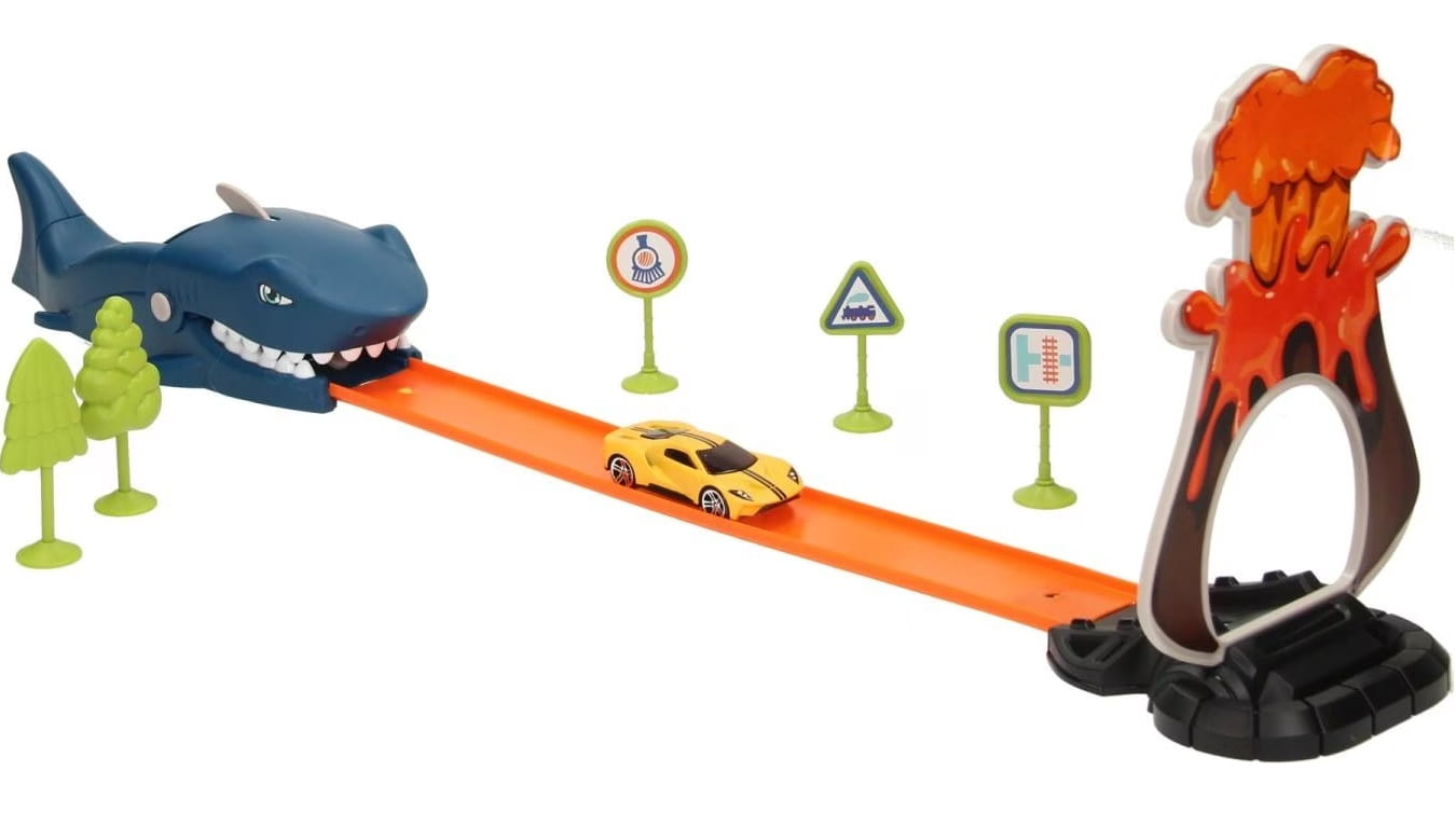 ⭐W opakowaniu: wyrzutnia - rekin, która wyrzuca samochodzik, autko, drzewka oraz znaki⭐