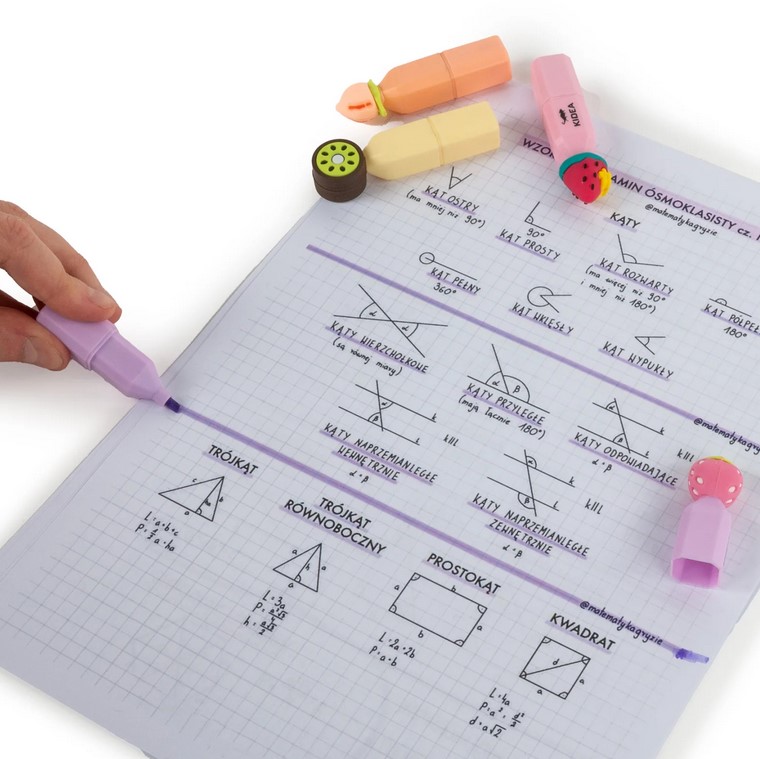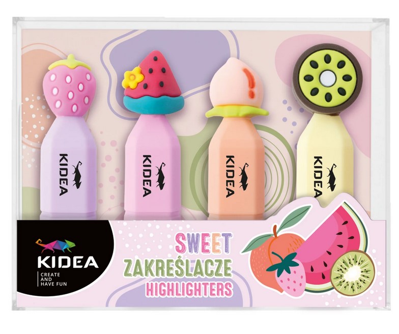 Zakreślacze Owoce 4 szt Kidea ZFO4KA to funkcjonalny i kolorowy zestaw, który ułatwia naukę i organizację notatek, dodając im przy tym odrobinę zabawnego, owocowego stylu.
