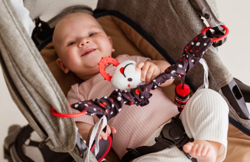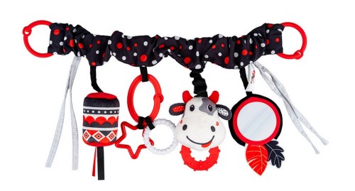 Kontrastowa zabawa w zasięgu ręki bobasa! Ta praktyczna zawieszka, wyposażona w elastyczną taśmę, dwa rodzaje mocowań (zapinane kółka oraz wiązane tasiemki) i cztery różne zabawki, sprawdzi się zarówno w domu, jak i na spacerze. Znajdziemy tu bezpieczne lusterko do samopoznania dziecka, materiałową głowę krówki z gryzaczkiem, dzwoneczek, a także twarde kształty, zawieszone na odczepianym kółeczku. Zabawka wykonana została z kontrastowych materiałów o zróżnicowanych fakturach, co stymulować będzie zmysły bobasa, rozwijając przy tym jego zdolności poznawcze.