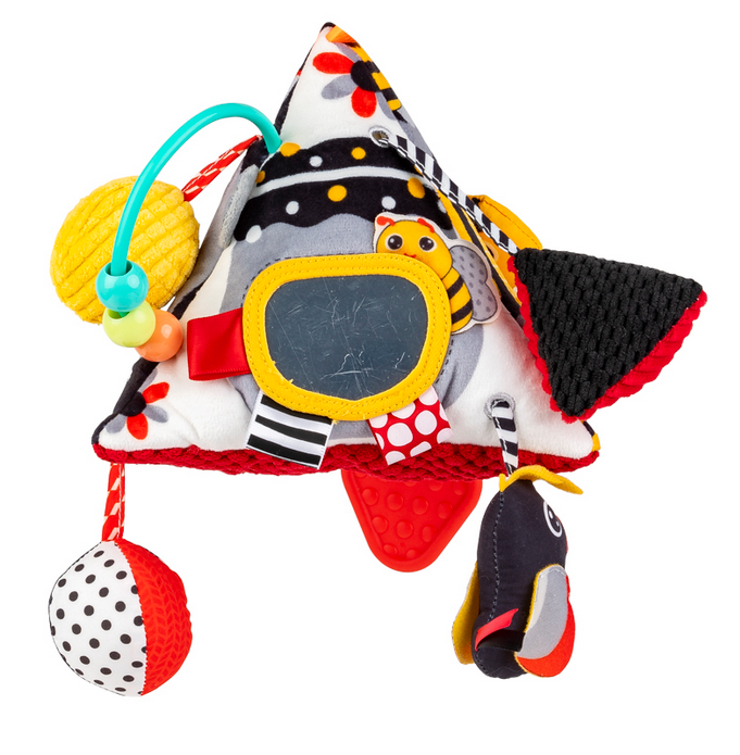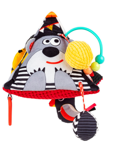 Wielofunkcyjna zabawka pełna zwierzątek i sensorycznych niespodzianek zapewni maluchowi wspaniałą rozrywkę! Na każdej z mięciutkich ścianek piramidki kryją się inne skarby, a wśród nich: piszczałka, bezpieczne lusterko do samopoznania dzidziusia, otoczone materiałowymi metkami, a nawet tasiemki do przeciągania, ozdobione mniejszymi zabaweczkami, w tym pszczółką, którą można włożyć do specjalnej kieszonki.