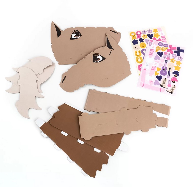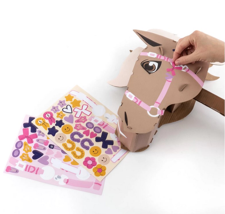 Po złożeniu konia możesz go ozdobić według własnego pomysłu – zestaw zawiera 68 kolorowych naklejek z motywami jeździeckimi, w tym ogłowie, kotyliony i eleganckie kokardy, dzięki którym Twój hobby hors stanie się naprawdę wyjątkowy.