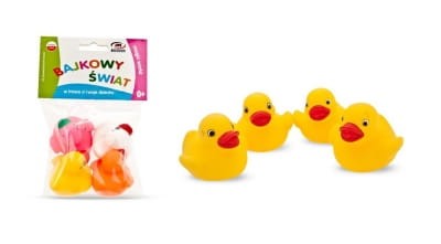 Zestaw czterech gumowych kaczuszek.